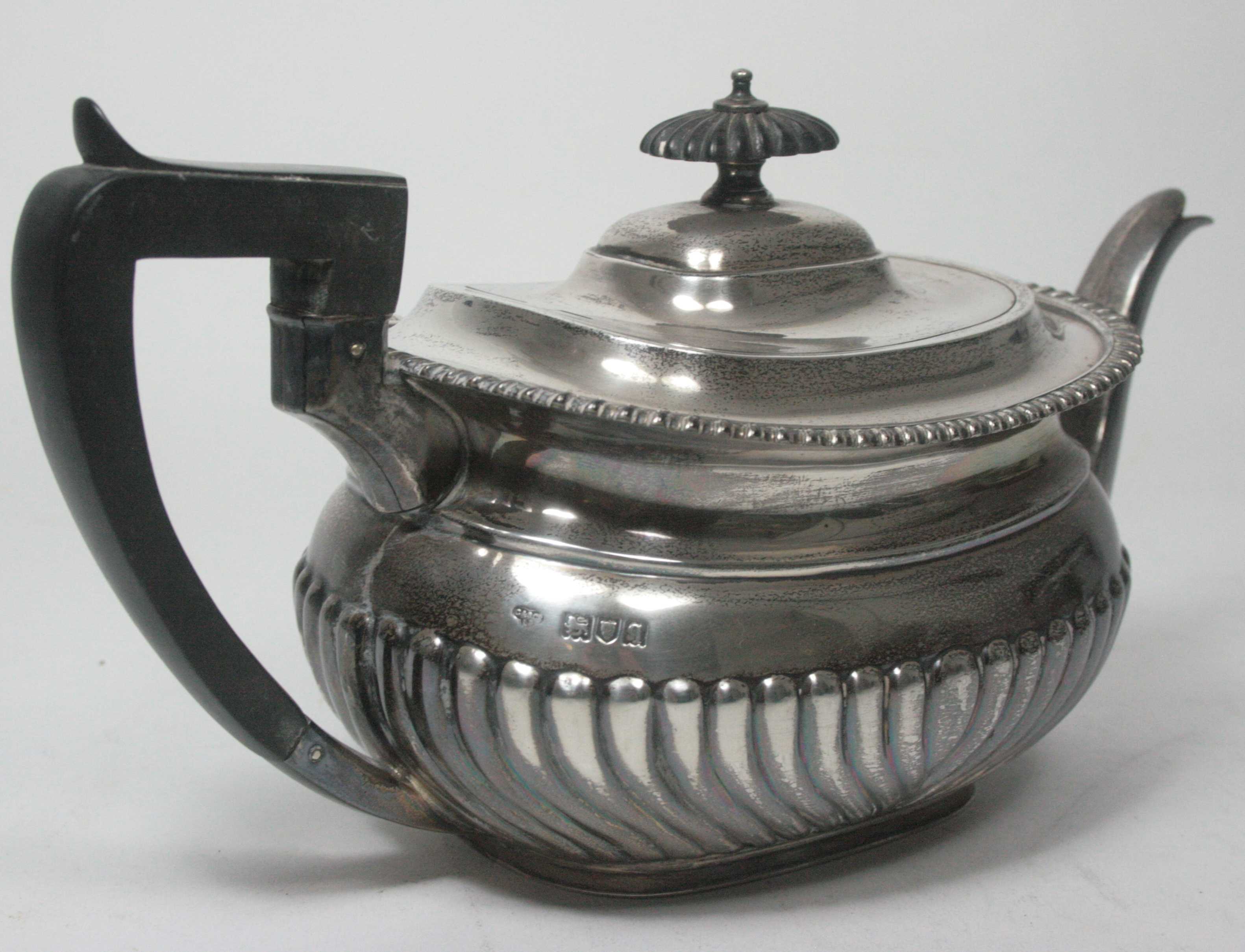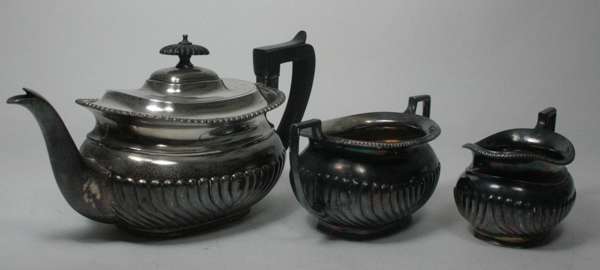 C & S Co Ltd, London 1911, comprising a tea pot, sugar bowl and milk jug, of squat baluster form with gadrooned detail to lower body (3)