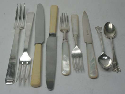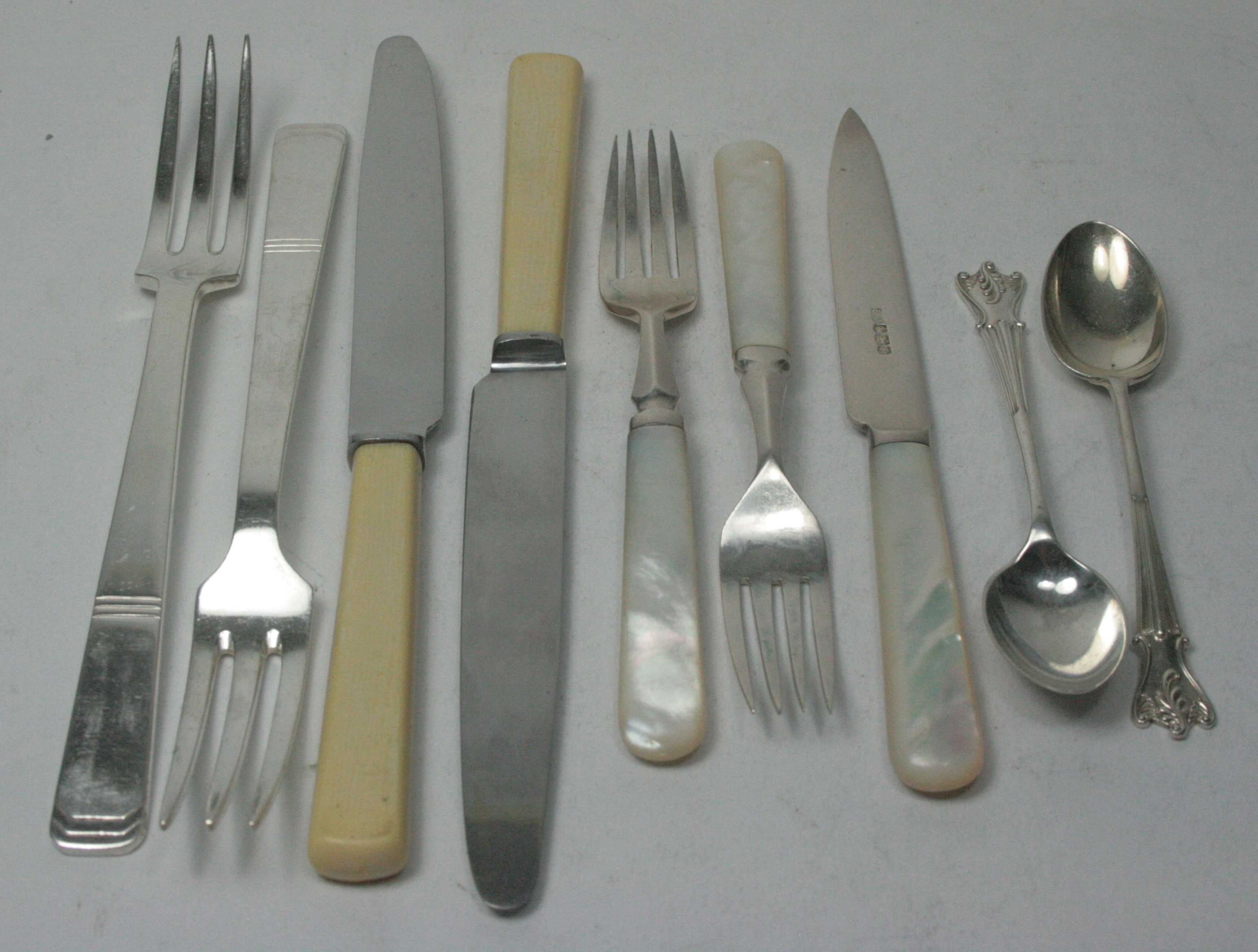 of various makers, dates and patterns, to include table and dessert spoons, table forks including a set of twelve silver plated table forks by Mappin & Webb, tea and coffee spoons, toddy ladles, a set of fruit knives and forks, grape scissors, knives and various other spoons and tongs (qty)