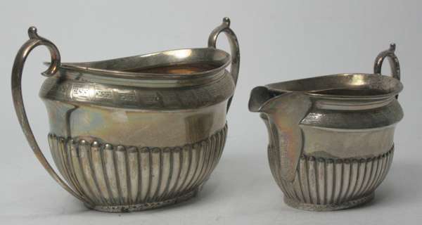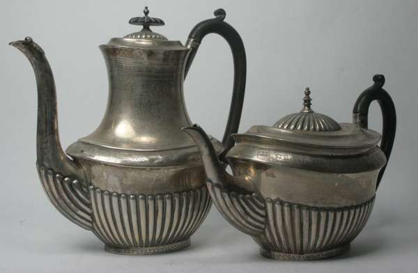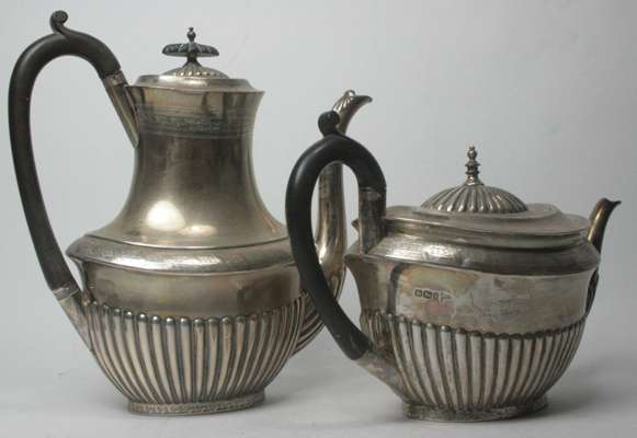 Walker & Hall, Sheffield 1909, to include a teapot, coffee pot, milk jug and sugar bowl, each with gadrooned detail to lower body and engraved detail to rim, with C scroll handles (4)
