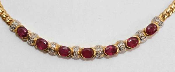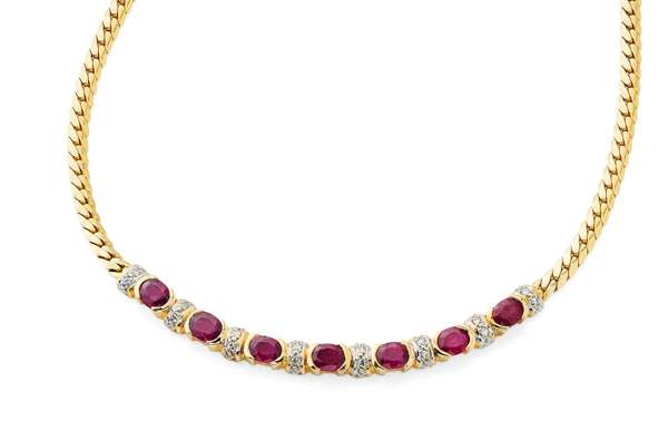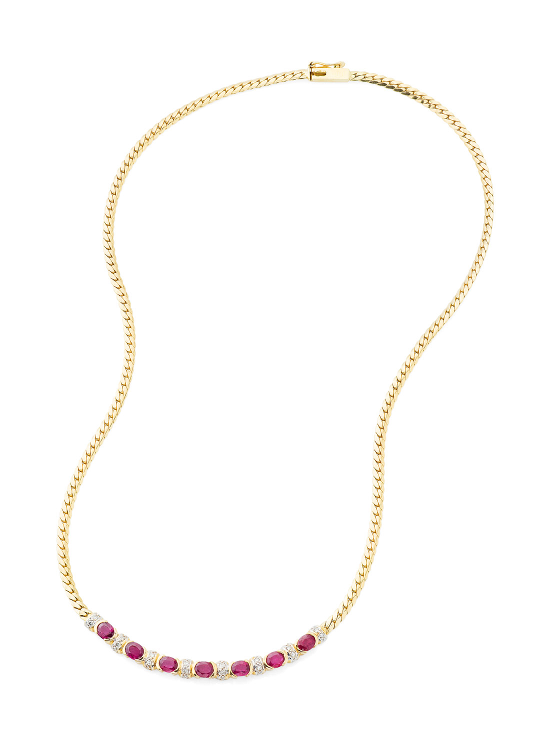 composed of a flattened curved 18ct gold neck chain with central motif of seven oval cut rubies in part rubover setting, with half curves set with small round cut diamonds