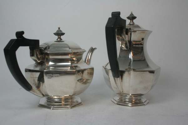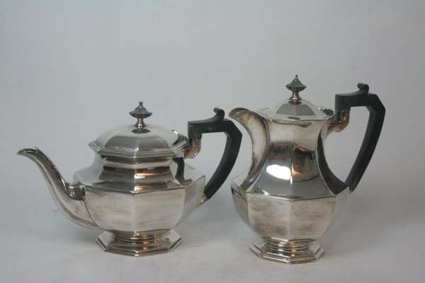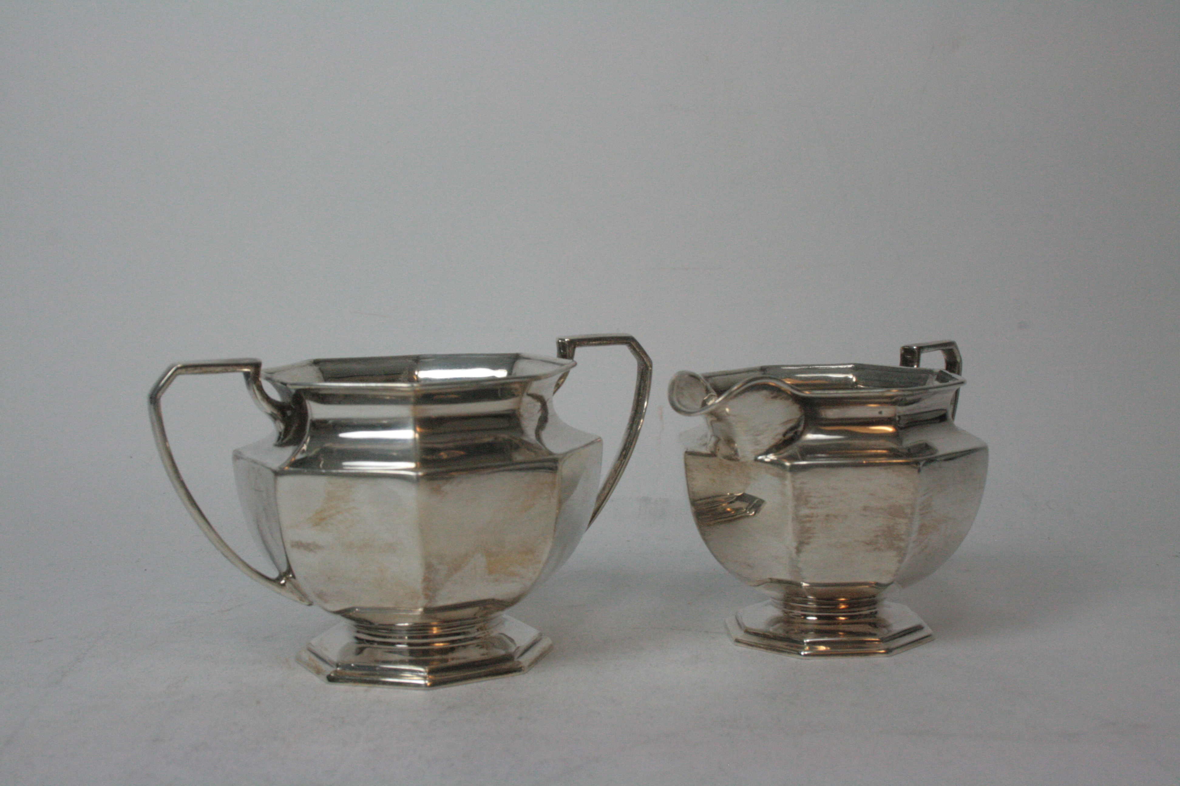 Sheffield 1931, of panelled octagonal form, angular handles, comprising: tea pot, water pot, sugar and cream