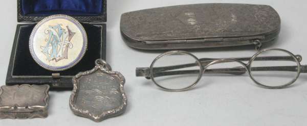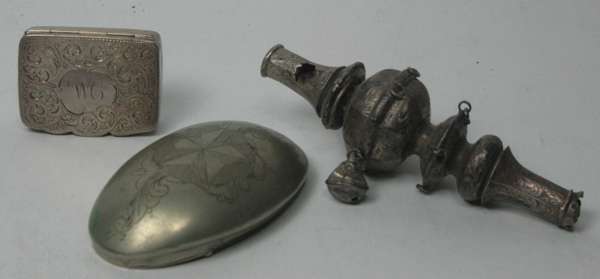 various snuff boxes, vinaigrettes, badges; a Victorian children's rattle and a silver spectacle case (qty)