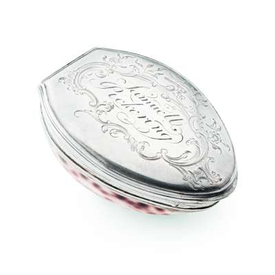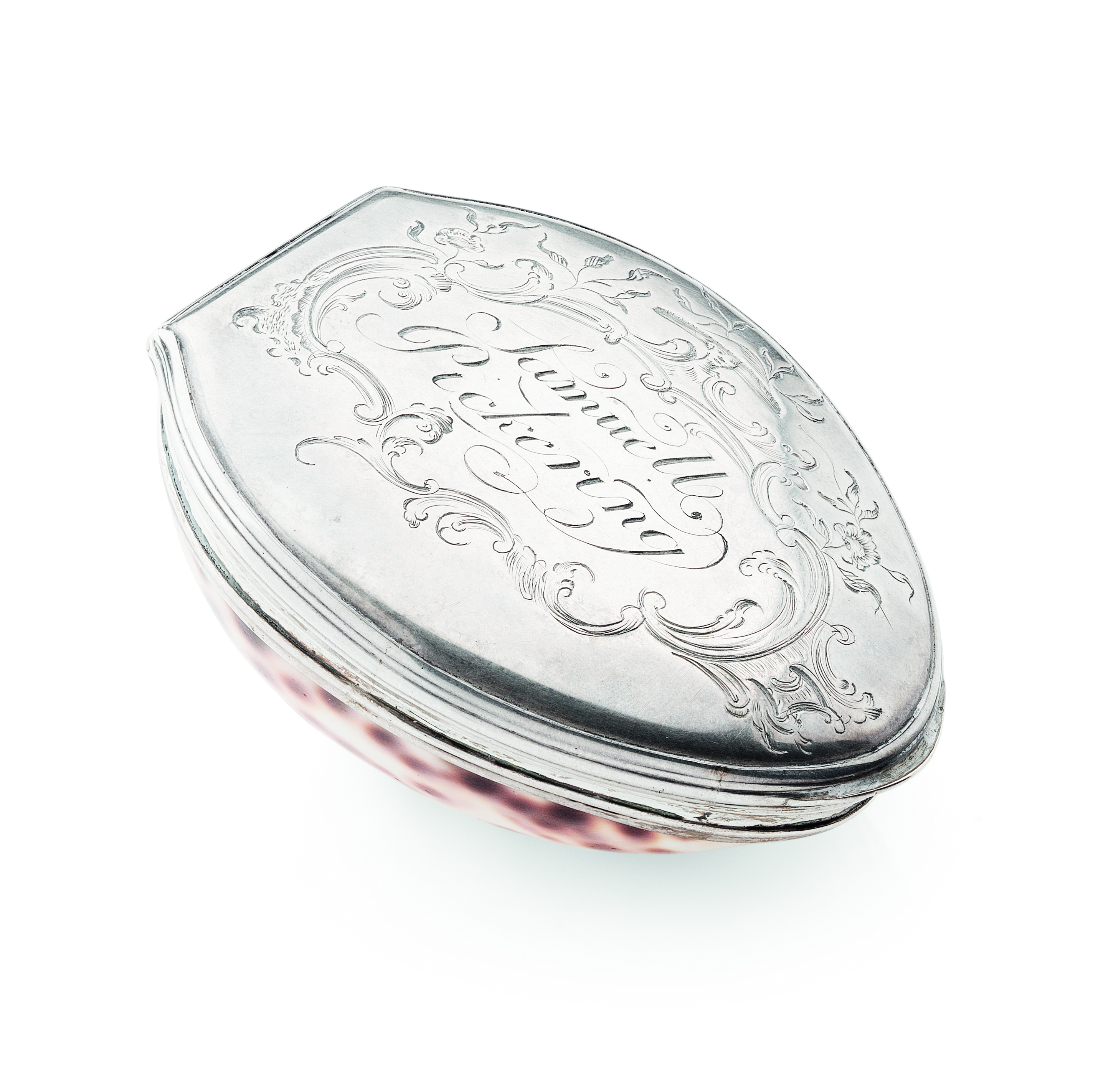 possibly Irish, makers mark only EC, the polished shell with reeded mounts and hinged slightly domed cover, with chinoiserie engraved scroll cartouche with name 'Samuel Pickering' within