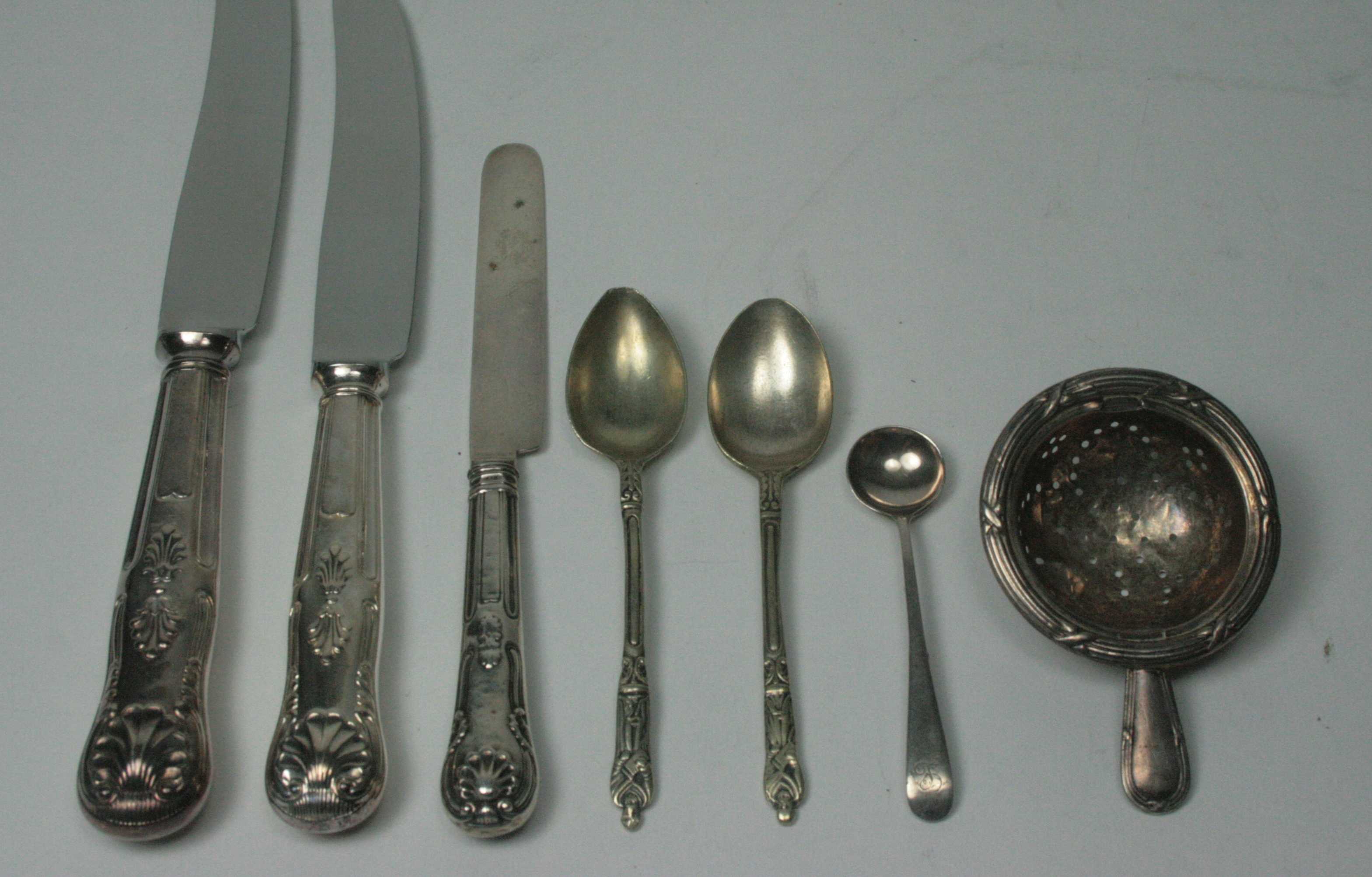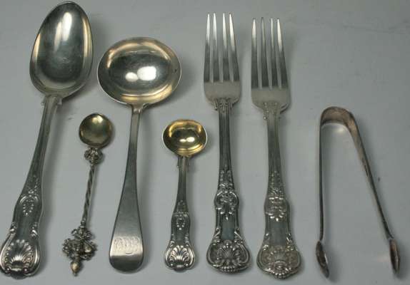 various dates and makers comprising table knives, side knives, table spoons, dessert spoons, table forks, dessert forks toddy ladles of queens pattern, kings pattern and other variants; together with a quantity of other miscellaneous flatware including teaspoons, ladles and sugar tongs etc (qty)