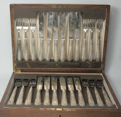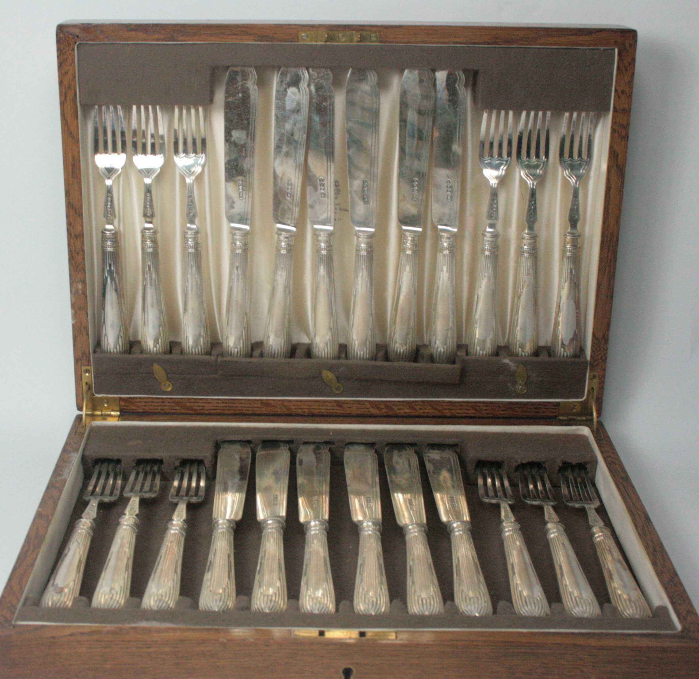 Sheffield 1894, comprising twelve pairs of knifes and forks, with simple shaped blades and forks with pointed handles with fluted decoration, in fitted case