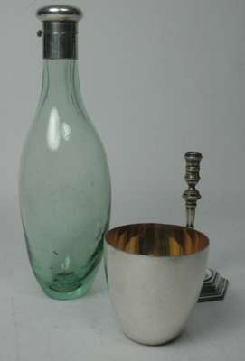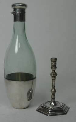 London 1897, of traditional form with baluster sconce above a tapered facetted stem and domed hexagonal base, with presentation inscription; together with a green glass and silver mounted flask, with pull off cup to base, Edinburgh 1893 (3)