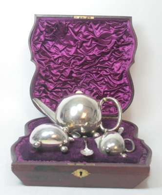 Charles Boyton, London 1885, comprising a tea-pot, sugar bowl, cream jug and spoons, each of spherical form to three ball feet in a fitted leater case, with presetentation inscription reading 'Presented to Colonel R V Malden 1st Sind Horse by some of the officers who served under him'; together with a pair of procelaine Sind Horse saucers, an ameture photographic exhibition metal and various military documents relating to Colonel R V Malden (Qty)
