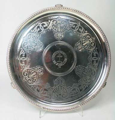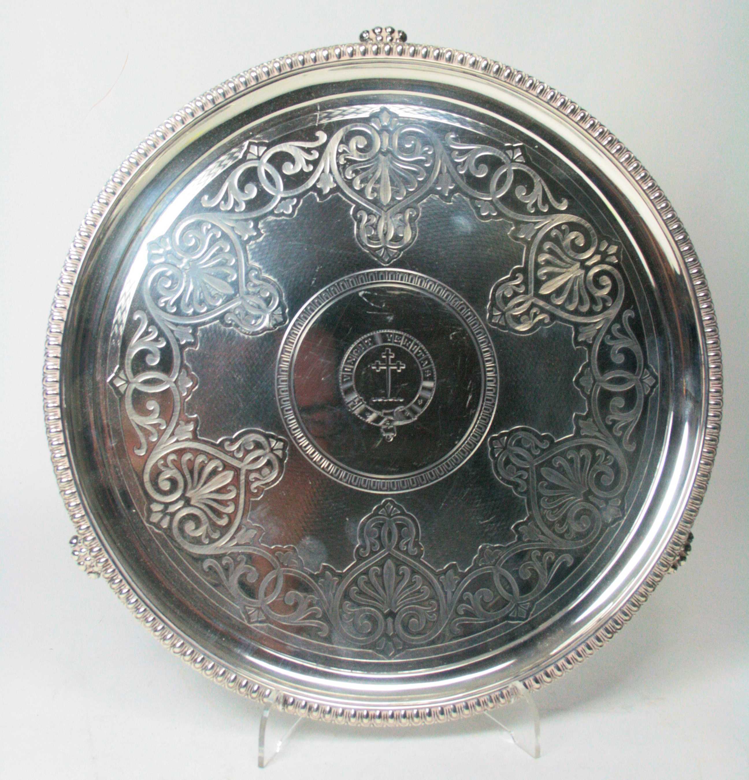 Barnard & Sons Ltd, London 1872, of circular outline with engraved detail and family crest to centre, reeded detail to the rim and three scrolling bracket feet