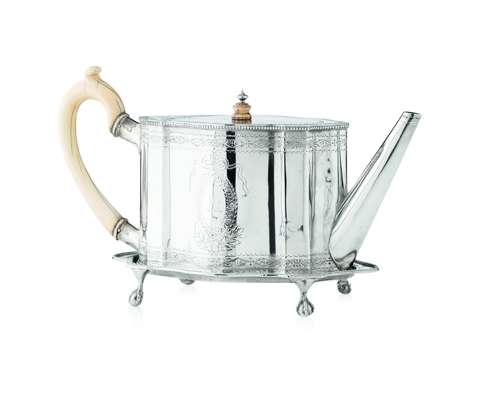 Robert Hennell, London 1865, the straight sided fluted body with bright cut engraving and oval ribbon tied cartouche with engraved crest, ivory C scroll handle and straight spout, raised on a matching stand; together with a matched sugar bowl W H, London 1857 (3)