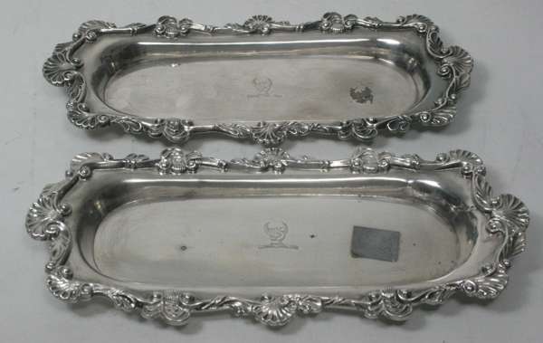 William Brown, London 1824, of elongated oval outline with cast shell scrolling border and engraved crest to centre (2)