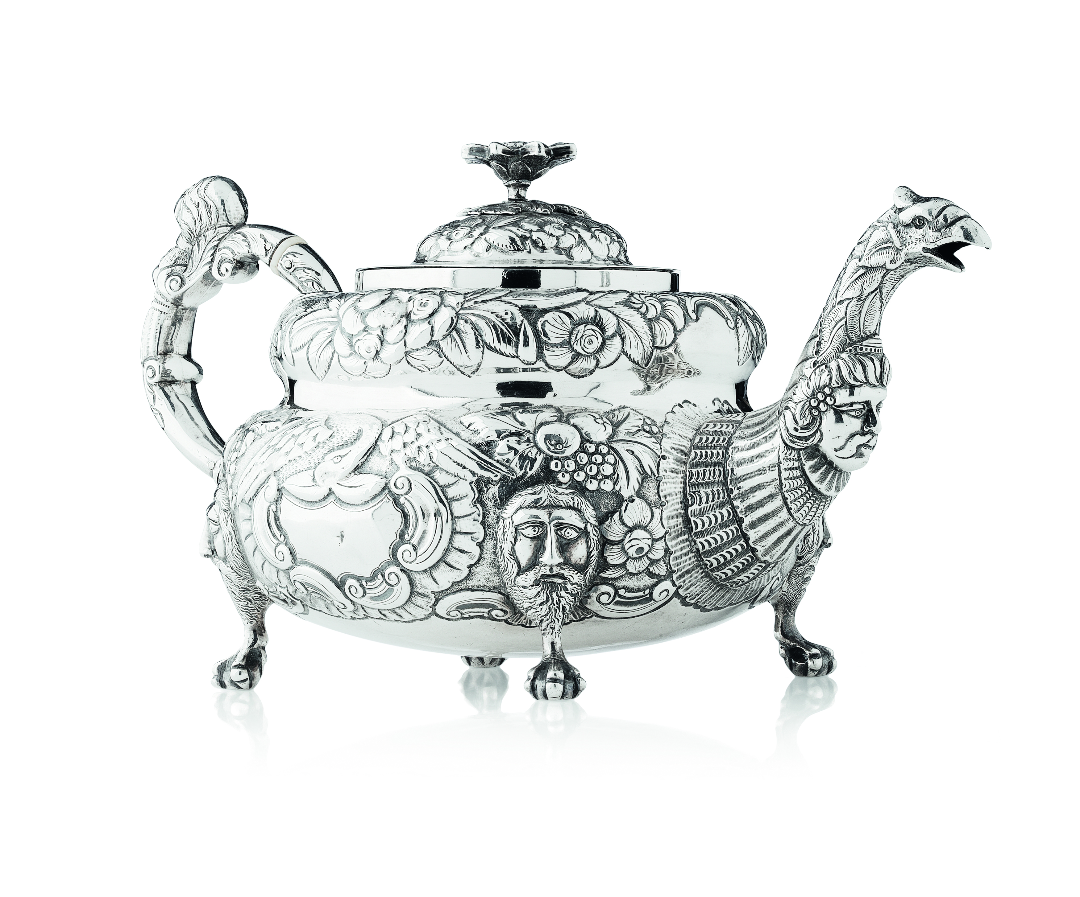 Edward Power, Dublin 1828, retailed by Edward Twycross, of squat baluster form, the body with heavily chased decoration of foliate and fruit design, the spout modelled as an eagles head, the handle of figural detail raised on mask and claw and ball feet