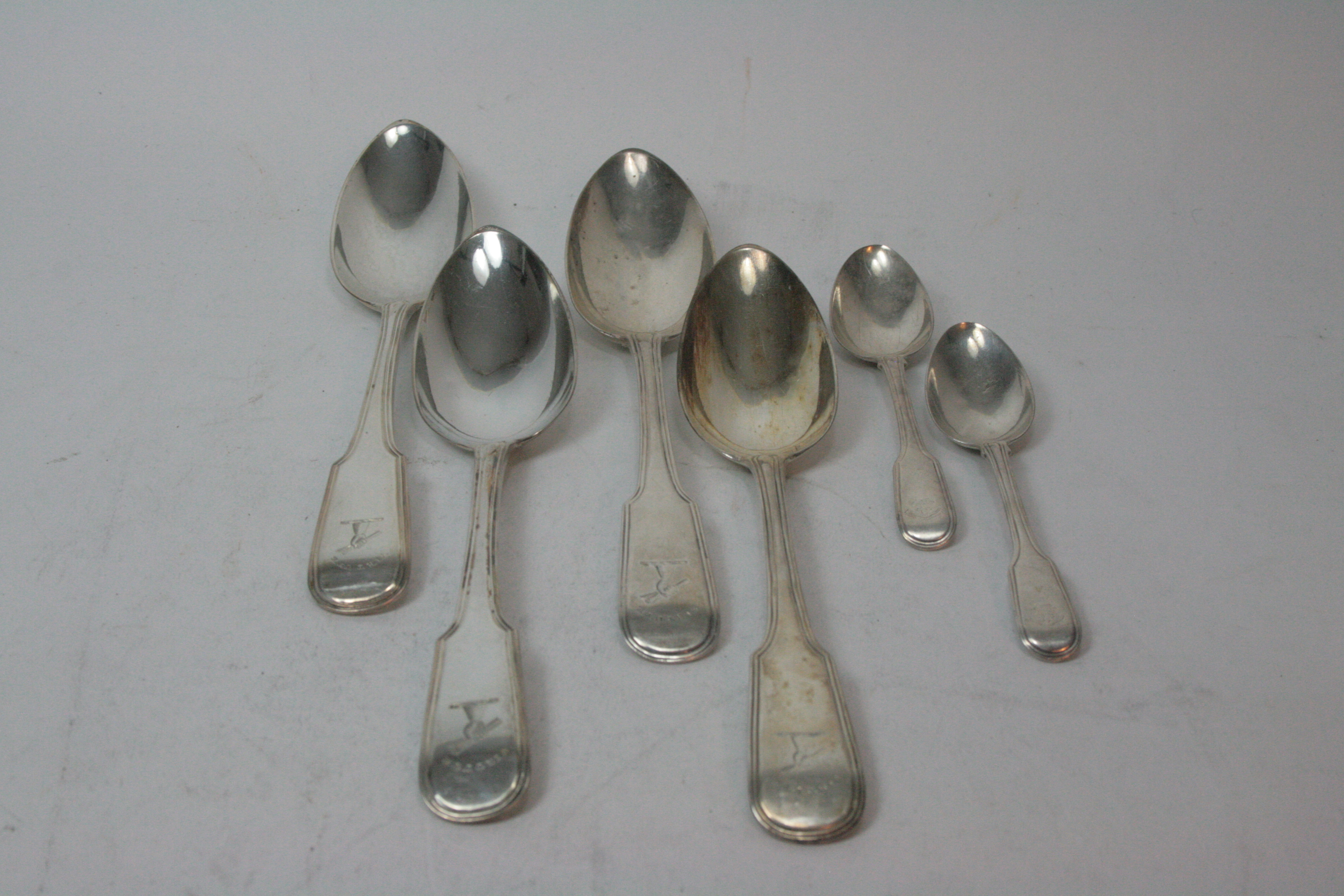 various dates and makers, double struck with engraved crest, to include table spoons, dessert spoons, teaspoons etc (qty)