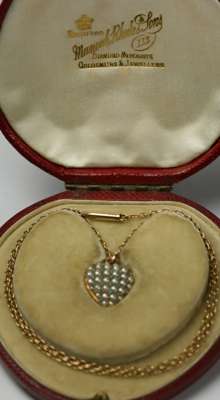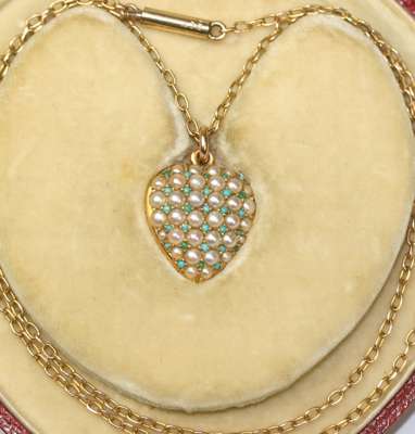 modelled as a heart in yellow metal, set throughout with small seed pearls and turquoises, a glazed panel to the rear, to a yellow metal fine belcher link chain, the clasp marked 9ct in a fitted box