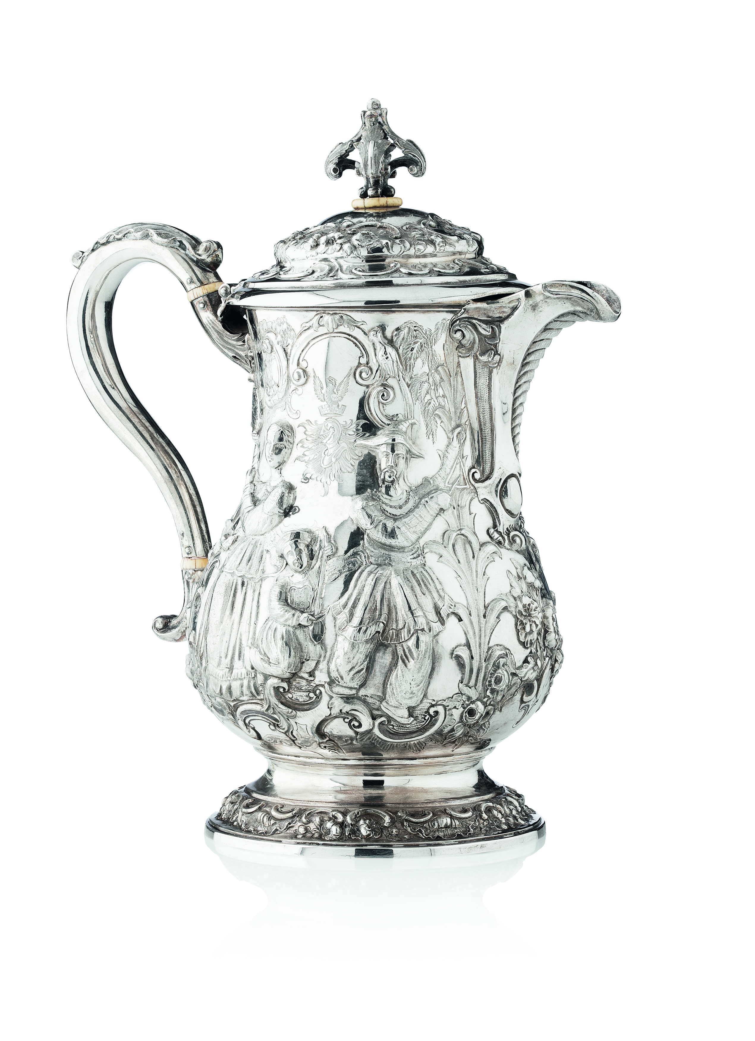 Robert Hennel, London 1851, retailed by G Rait of Glasgow, the hinged cover with scrolling leaf finial, the baluster body with bold decoration of musicians in an outdoor scene, engraved crest and with an interior scene to the other side, bold leaf clasped scroll handle, spreading foot