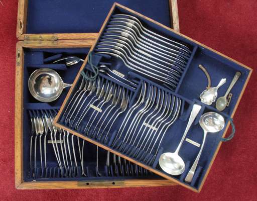 various dates and makers, predominantly George III London, mainly Old English pattern but some Hanoverian and Fiddle patterns noted, comprising soup ladle, serving spoon, pair of sauce ladles, pair of sifter ladles, pair of salt spoons, twelve tablespoons and forks, twelve dessert forks and eleven dessert spoons, contained in an oak canteen with lift out tray
