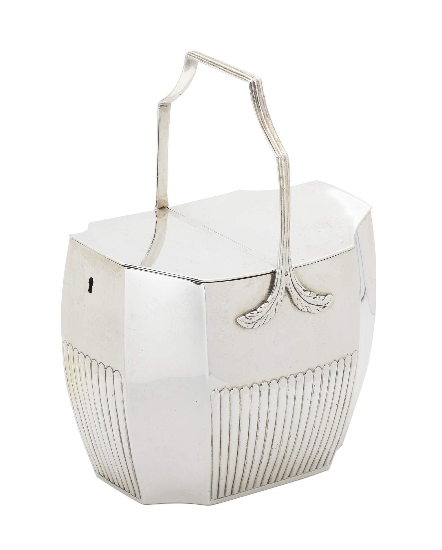 John Robbins, London 1800, of tapered rectangular form with incurved corners, the body with fluted decoration, twin flush hinged compartments, with lock and reeded loop handle