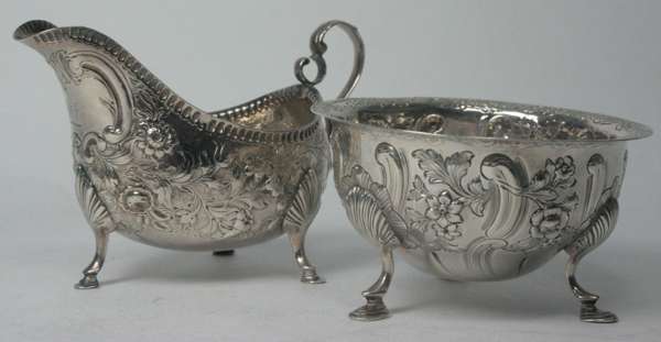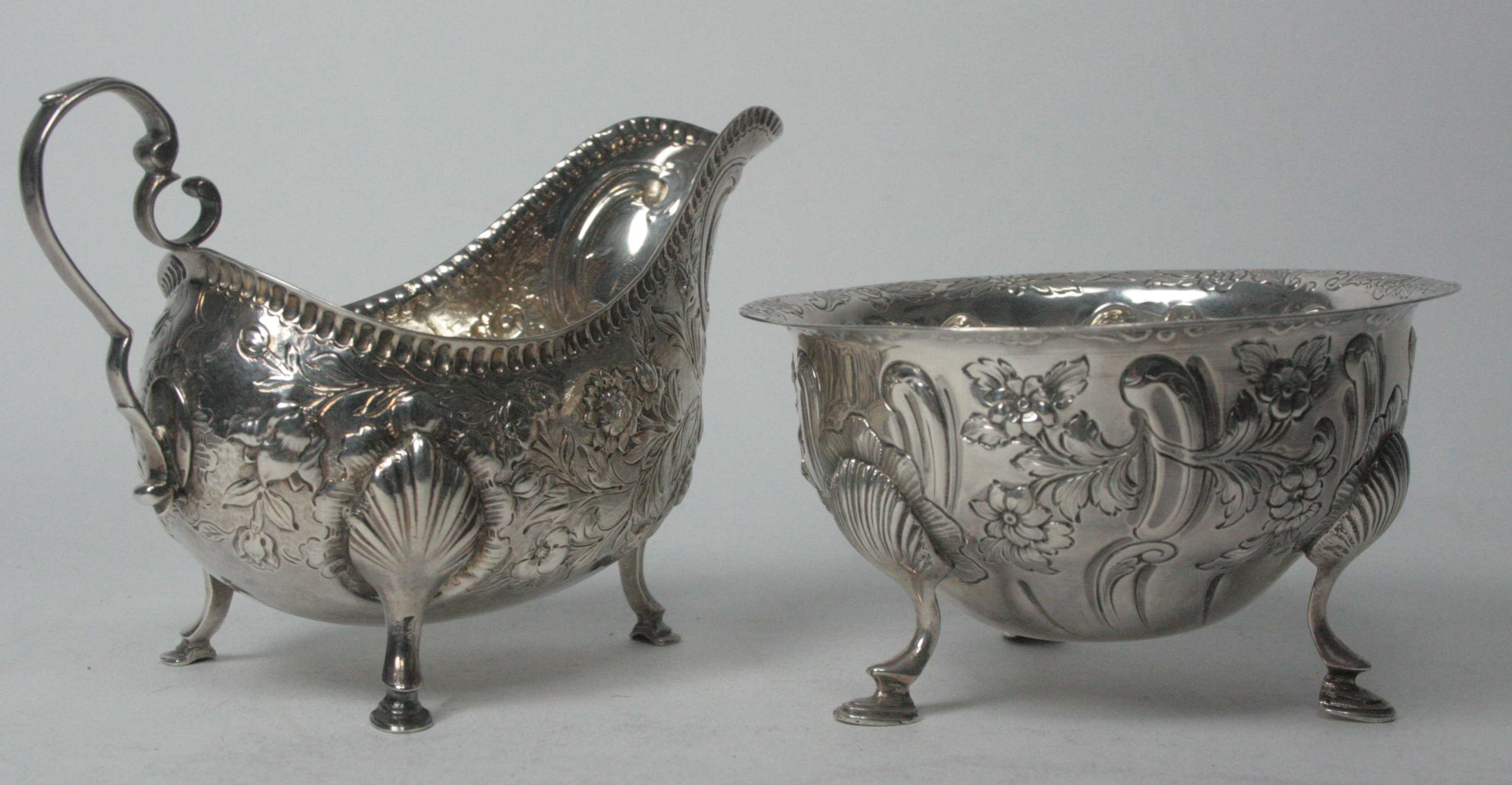 Dublin, indistinct marks circa 1770, of conventional form with embossed floral detail and engraved crest, to three hoofed feet; together with an associated sugar bowl of similar embossed floral detail; West & Son, Dublin 1932 (2)