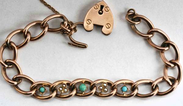 the central curb links set with alternating seed pearls and turquoise, with a padlock clasp