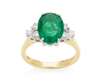 the central claw set oval cut emerald flanked to either side by three round brilliant cut diamonds