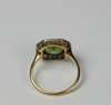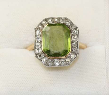 the rectangular cut peridot collet set in a single border of small round cut diamonds, to a plain yellow metal shank, unmarked