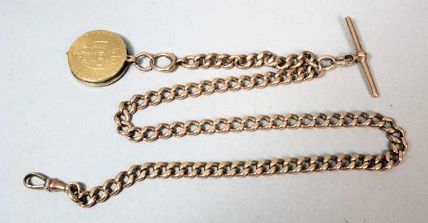 15ct gold, graduated curb links, 'T' bar and fob constructed from a guinea