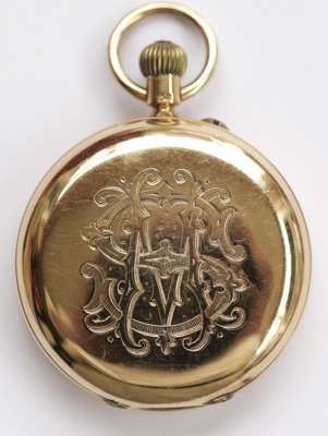 engraved monogramme and inscription, plain dial, Roman numerals, lever movement