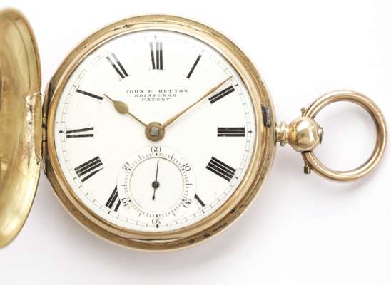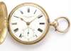 key wind, the enamel dial with Roman numerals and subsidiary seconds dial, with engraved vacant cartouche to front of case; together with two pocket watch keys and a ladies yellow metal wrist watch with leather strap (4)