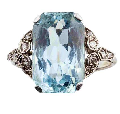 Ring size: N, estimated gem weights: aquamarine: 6.00cts, diamonds: 0.06cts (total)