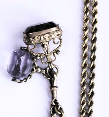 Of thick rope twist, two small gold mounted fob seals, one set citrine, the other with swivel amethyst, the clip marked 15 and engraved number 10839