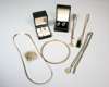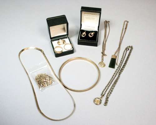 to include a 9ct gold mounted diamond set wedding band; a 9ct gold plain broad wedding band; a 9ct rose gold faceted slim wedding band; a mounted tapering jadeite pendant, inscribed ALA, suspended from a trace link chain; a pair of three-coloured stud earrings; a circular ram-pierced pendant, stamped 750, with chain stamped 375; a glazed circular pendant containing gold nuggets, suspended from a belcher link chain; a 9ct gold fancy flat link necklace; three assorted chains; a Greek Key patterned metal core bangle; also a single Greek Key patterned ear stud (13)