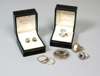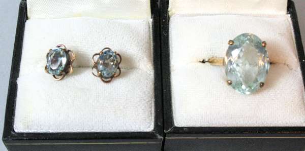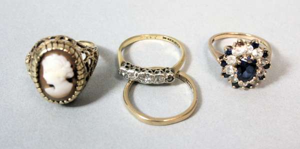 to include a pair of aquamarine stud earrings, a 9ct gold aquamarine set ring; a 9ct gold aquamarine set brooch in a pierced scrolling border; a plain 9ct gold band; a 9ct gold set cameo ring; an 18ct gold graduated five stone diamond ring, a blue and white gem set cluster ring (qty)