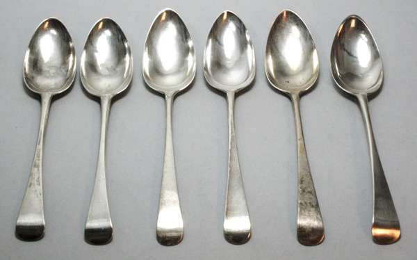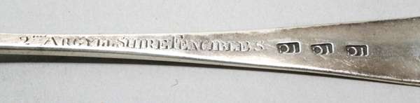 all inscribed to stem 2nd Argyllshire Fencibles, all struck with makers marks only, three by IQ, two LB and on IC, all of Old English pattern with vacant terminals (6)