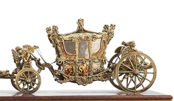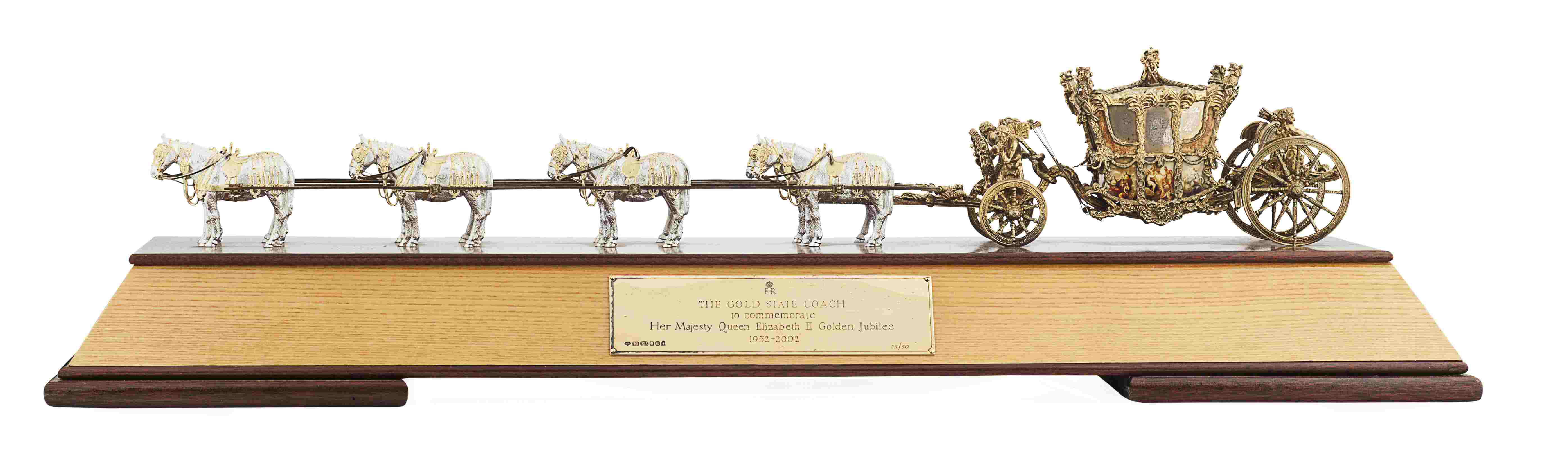 London 2002, 25/50, a silver and gilt replica of the Gold State Coach, enamel detail to coach body, with eight horses, to a polished wooden base with gilt commemorative plaque, engraved inscription 'The Gold State Coach to commemorate Her Majesty Queen Elizabeth II Golden Jubilee 1952-2002' and another reading 'The London Goldsmiths Company Ltd . . .'