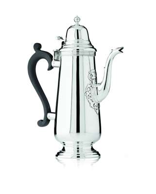 Sheffield 1979, the slight baluster body with applied cut card detail to curved spout and wooden handle, with hinged domed cover and spool foot
