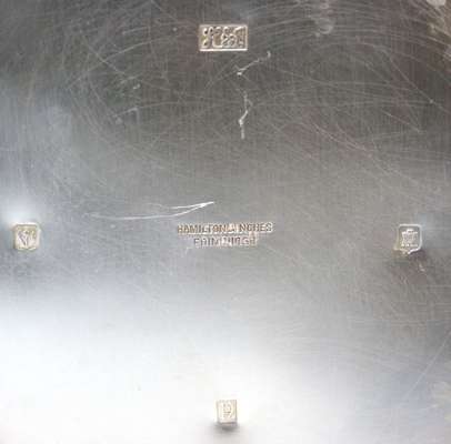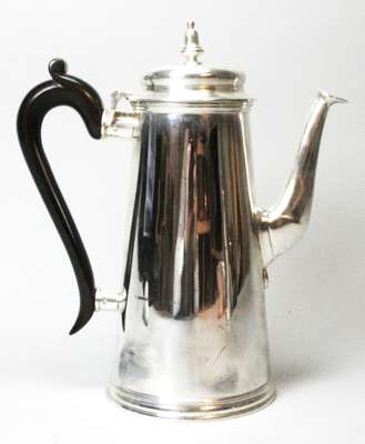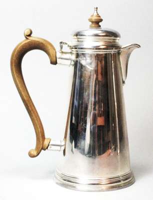 Hamilton & Inches, Edinburgh 1963, the flared cylindrical body with with simple rim and foot, the domed hinged cover with acorn finals, S scroll wooden handle and slender spout; together with a modern hot milk jug of similar form with short spout, London 1957
