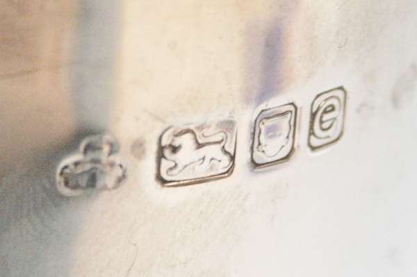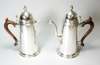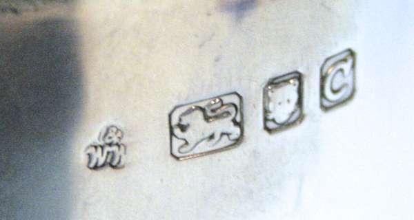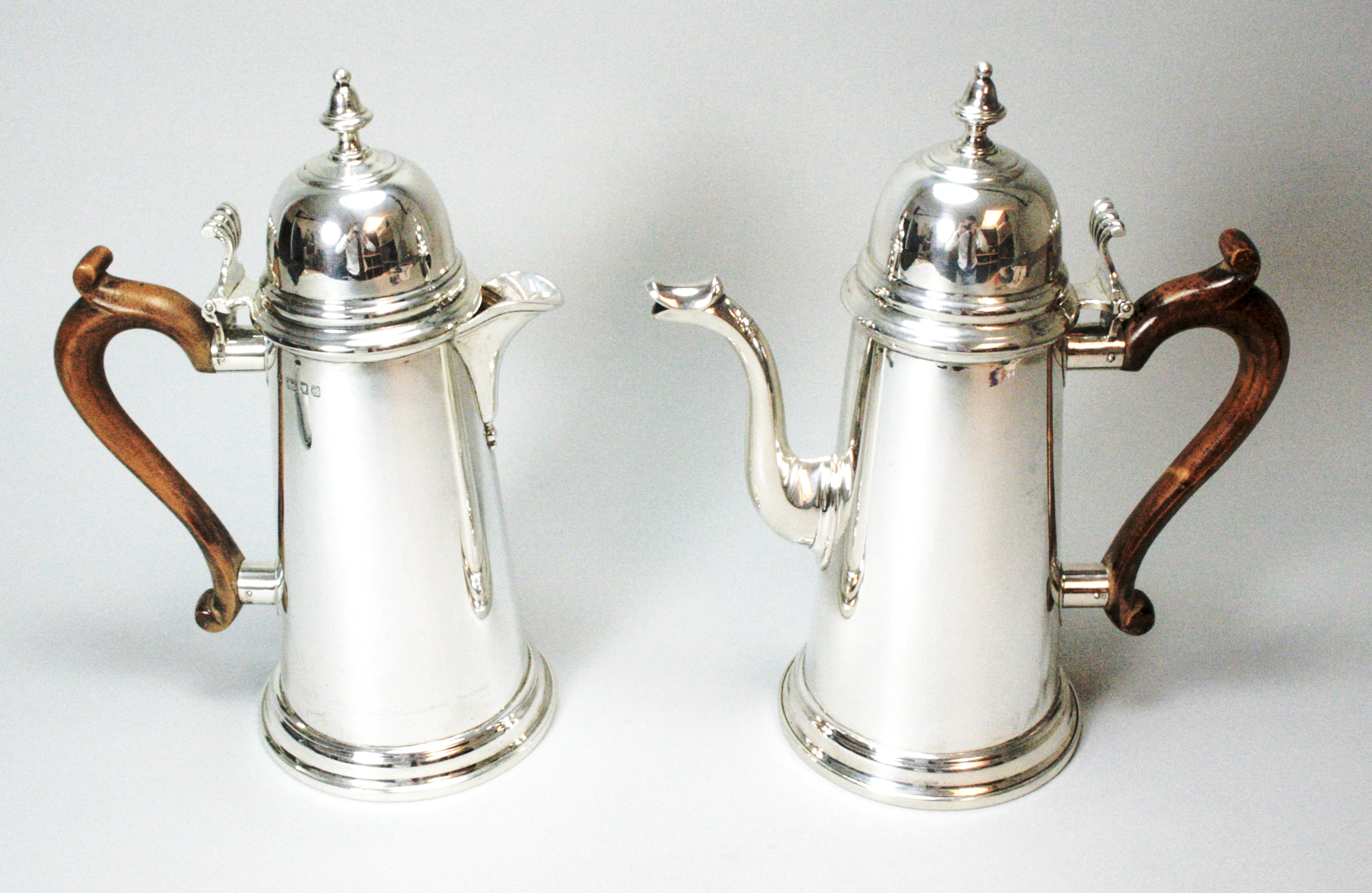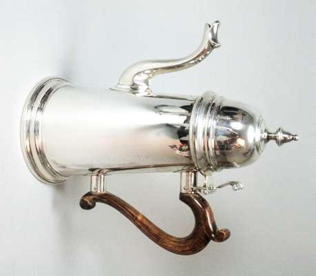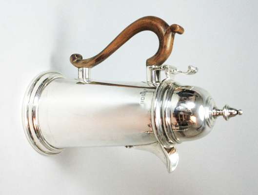 Wakely & Wheeler, London 1960, of plain tapering cylindrical form, with reeded detail to foot and rim, the domed hinged cover with scrolling thumbpiece, with a simple C scroll wooden handle (2)