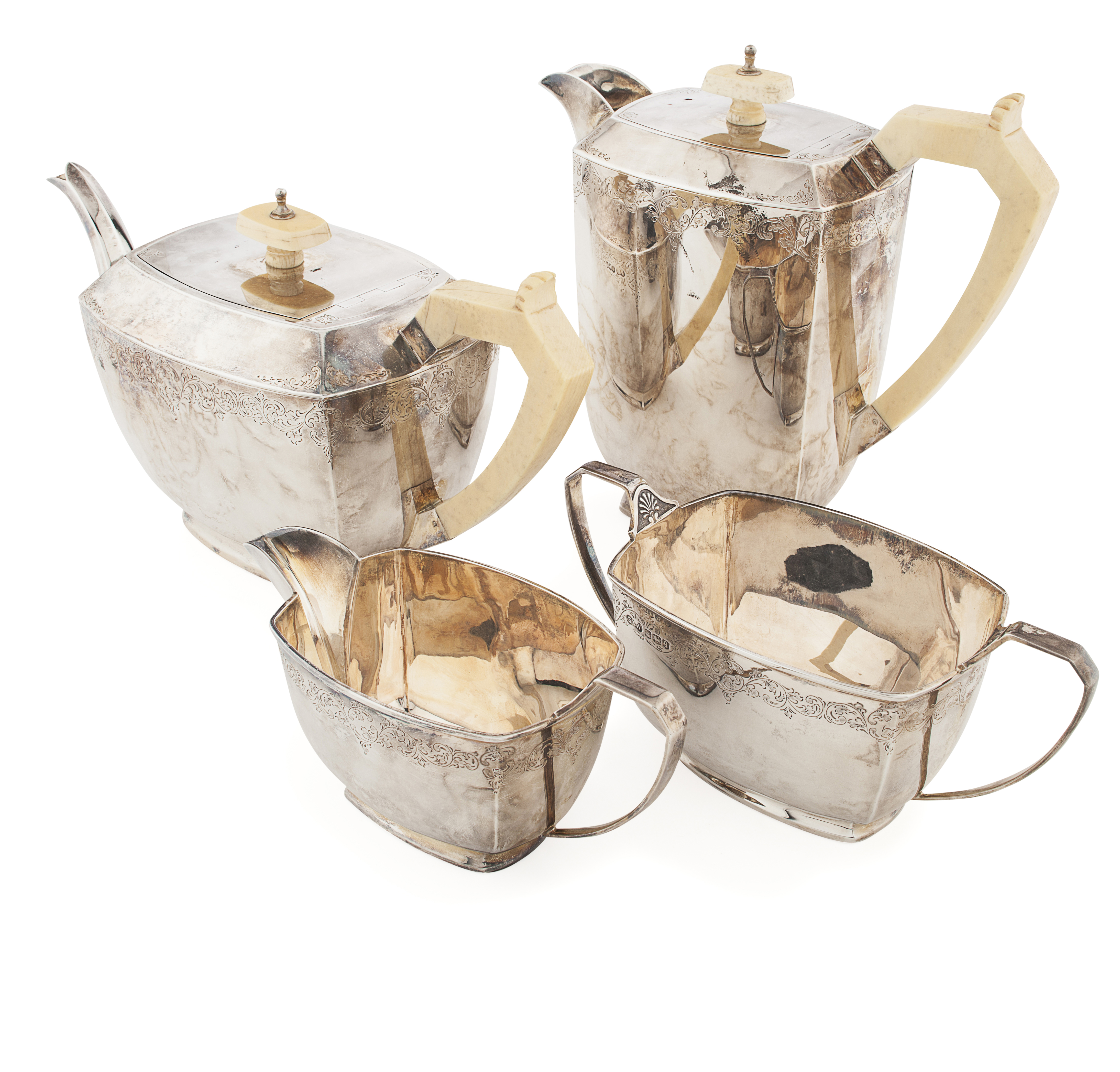 S&W, Sheffield 1933, comprising a teapot, hot water pot, sugar bowl and milk jug, each of rounded rectangular form with engraved floral detail to rim, to a plain square foot with angular ivory handles (4)