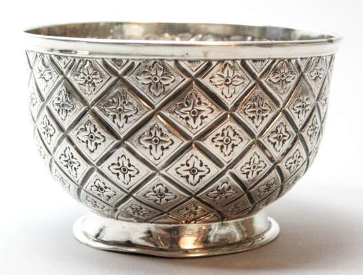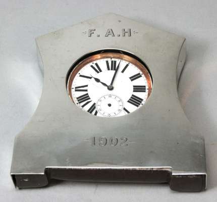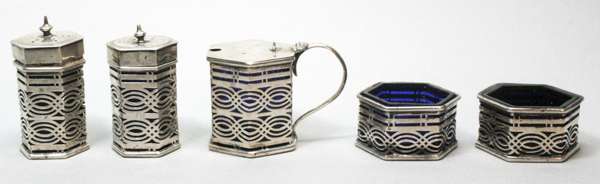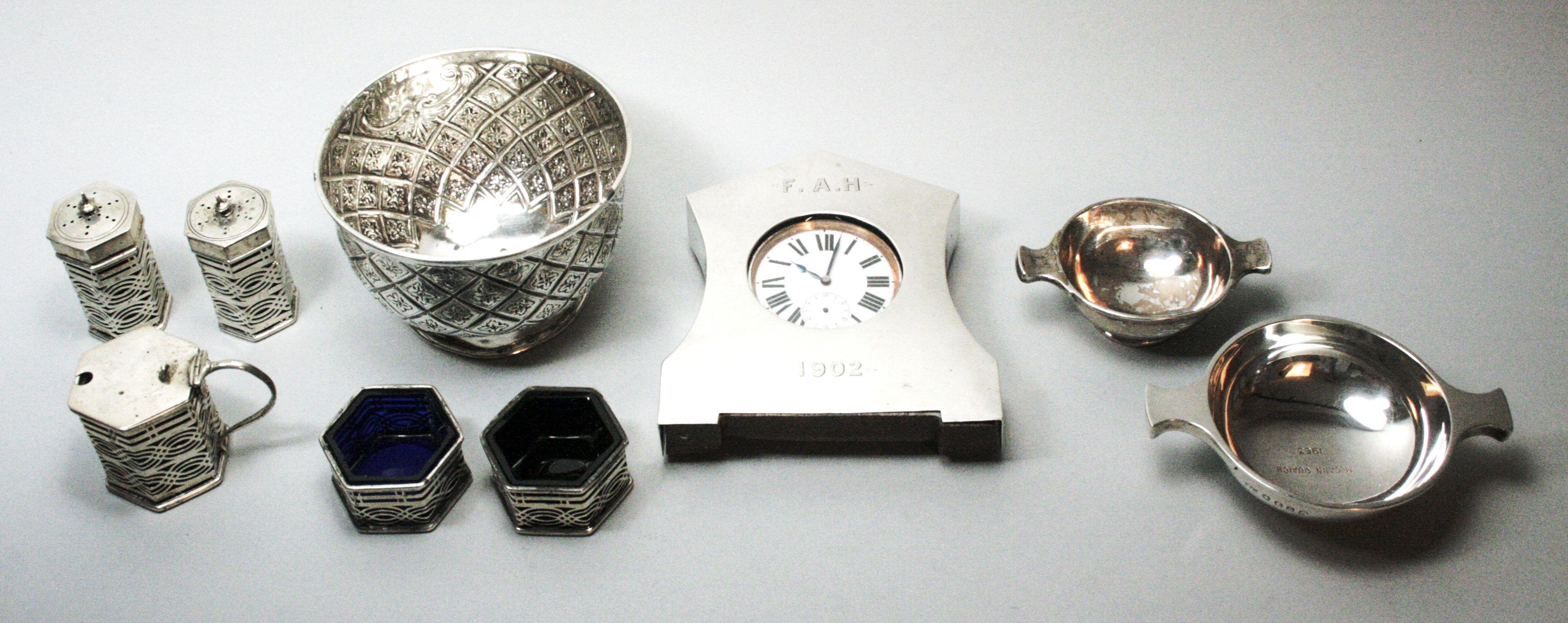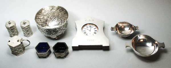 to include a five piece octagonal condiment set with pierced scrolling detail to body and blue glass liners, comprising two open salts, a pepper and salt and a mustard pot; two small silver quaichs; a small silver with hatched floral detail; a traveling clock with silver sleeve cover (qty)