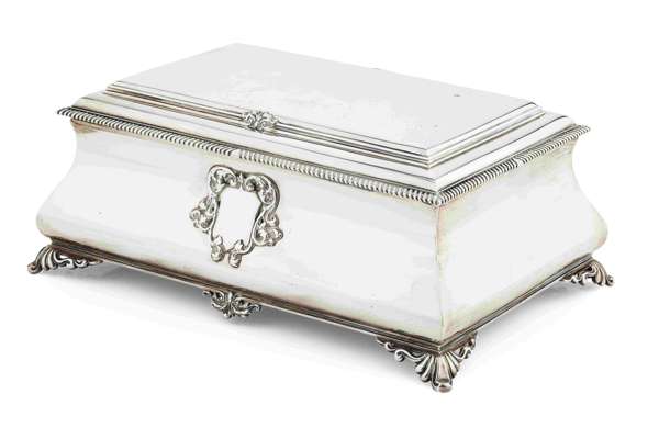 PB Ltd, London 1929, of rectangular form, the stepped lid with gadroon border, the cavetto sides with centrtal scrolling cartouche, all raised on scrolling cast feet, gilt and wood lined interior