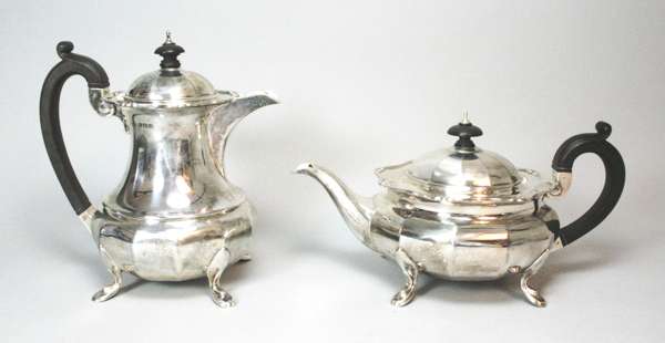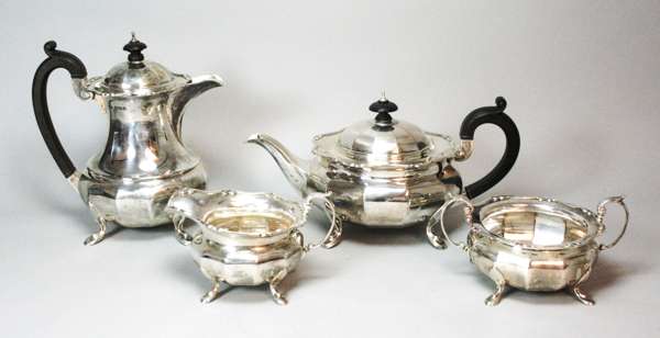 Docker & Burn, Birmingham 1925, of squat panelled form, comprising a tea pot, hot water pot, sugar bowl and milk jug, with scalloped rim, scrolling handles and engraved initials (4)