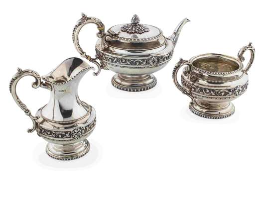 John Round & Son Ltd, Sheffield 1913, comprising; a tea-pot, sugar bowl and milk jug, of baluster form with beaded detail throughout and a central band of cast foliate decoration, each with domed foot and leaf clasped scroll handles with beaded detail (3)