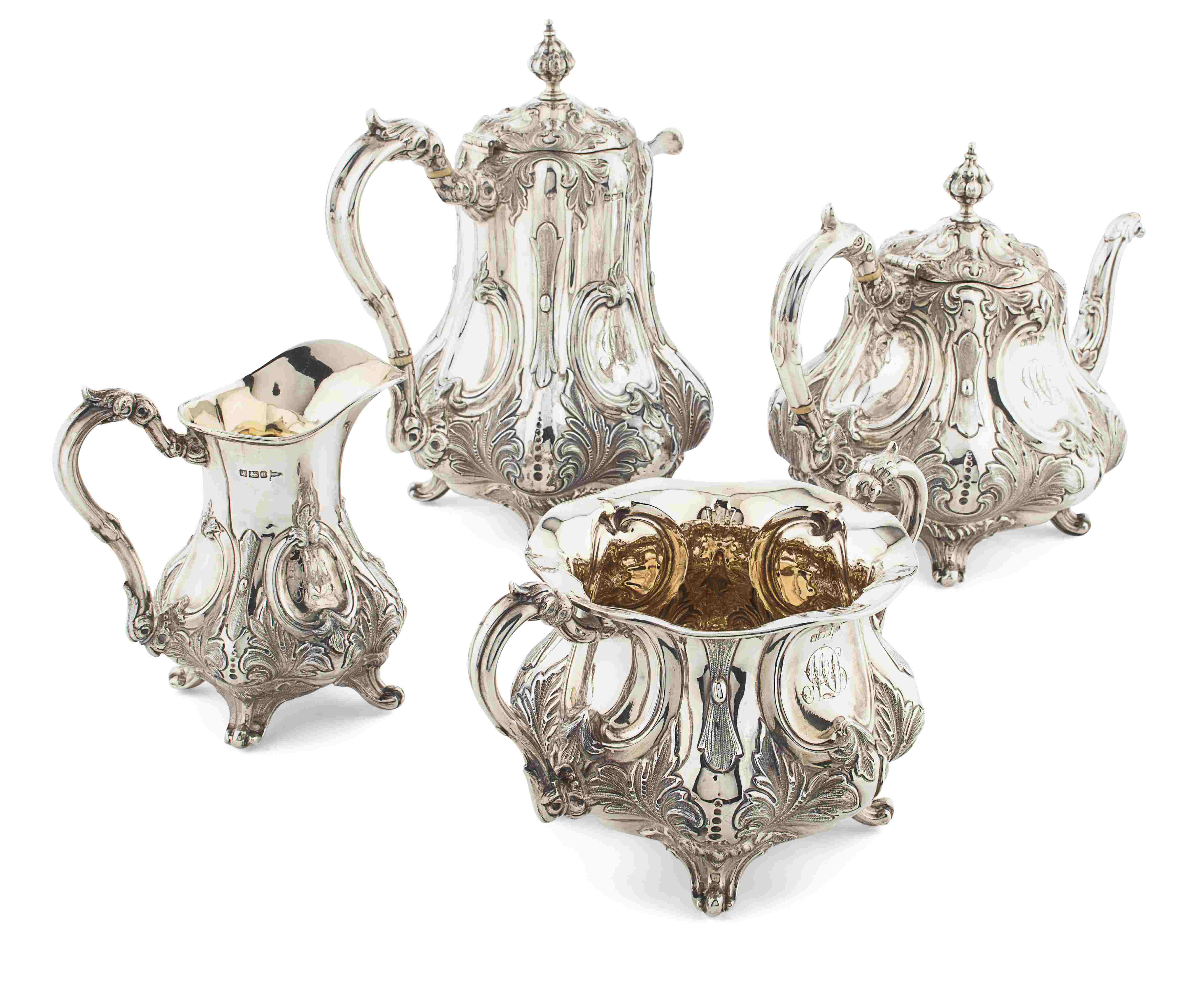 Walker & Hall, Sheffield 1905, comprising; a tea-pot, hot water pot, sugar bowl and milk jug, of lobed baluster form with chased foliate detail throughout and engraved initials 'ML' to cartouche, each to four scrolling bracket feet and cast C scroll handles of similar design, knopped foliate finials (4)