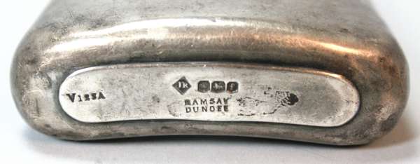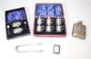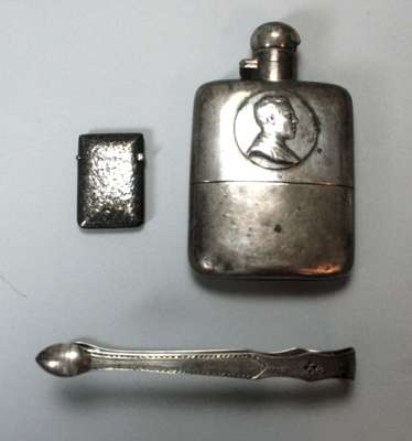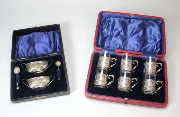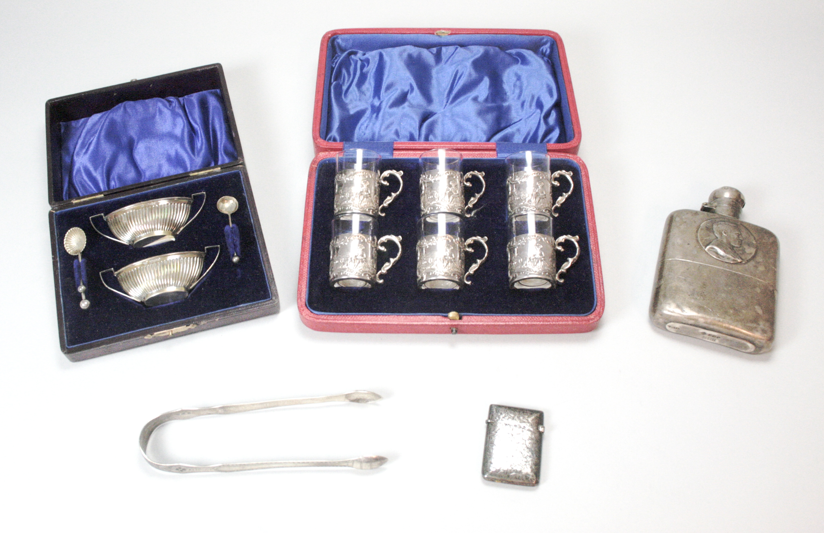 J Dixon & Sons, Sheffield 1905, the silver sleeves with embossed pastoral scenes with cast handle and clear glass liners, cased; together with a cased salt set, vesta case, hipflask and sugar tongs (qty)