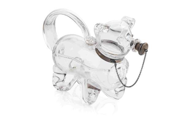 Elkington & Co, London 1904, the waisted blown glass body with applied glass legs and stylised tail handle, the silver collar with chain-linked silver mounted cork stopper