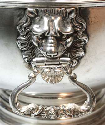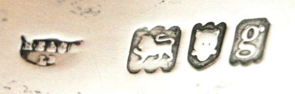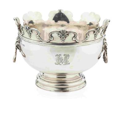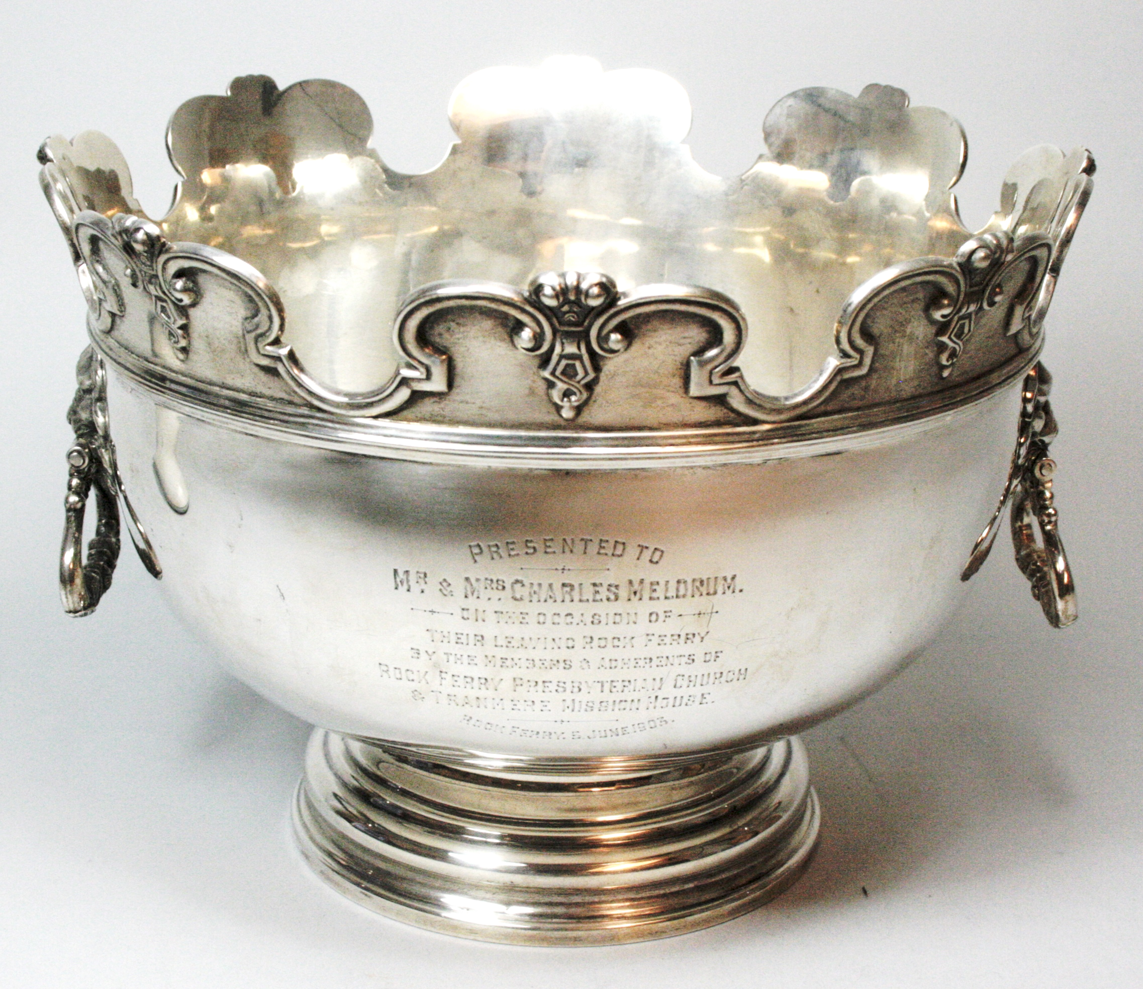 London 1902, of traditional form with plain body and scalloped rim with pendant details, raised on a stepped domed foot