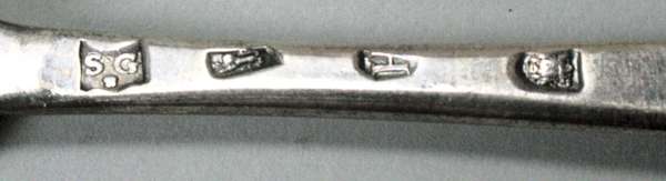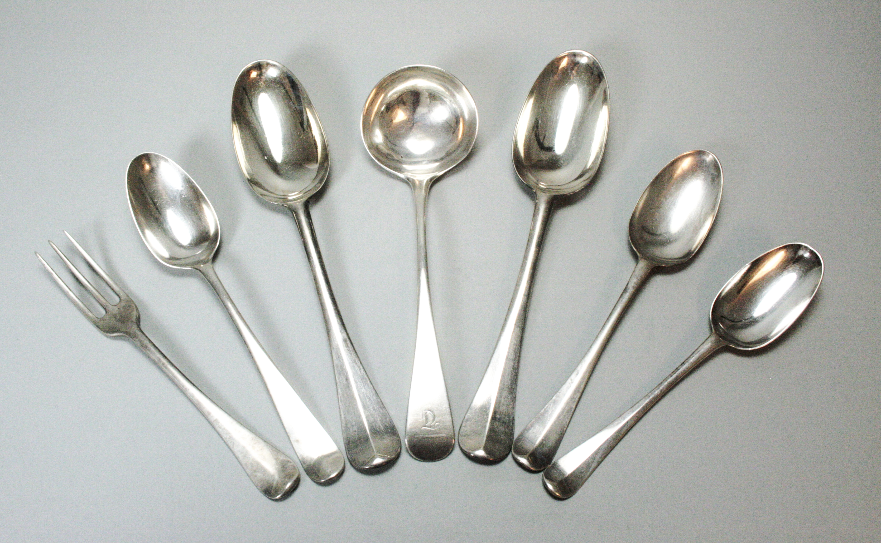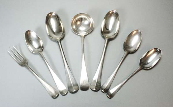 of various dates and makers, to include twenty three dessert spoons and nine table spoons, all of Hanoverian pattern with rat-tail to reverse of bowl and various initials and crests to terminals; a toddy ladle of Old-English pattern, four three-tined forks of Hanoverian pattern with engraved script initial to terminal (qty)