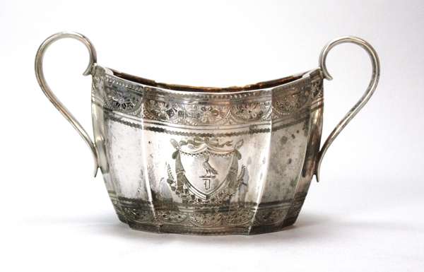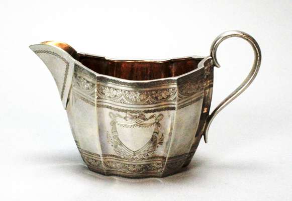 Martin, Hall & Co, Sheffield 1897 & 1898, comprising a tea pot, sugar bowl and milk jug, of oval panelled form with engraved foliate detail and swag and foliate crest (3)