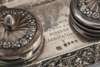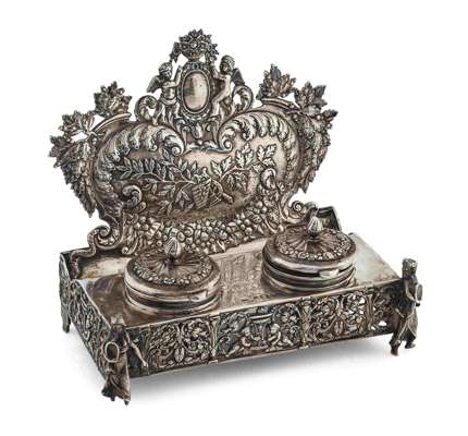 Solomon Herz & Co, import marks for London 1891, bearing earlier French marks, of rectangular outline with pierced scrolling and foliate detail to sides, raised on four feet, two modelled as Grecian women, with a scrolling foliate decorative back plate, topped by cherubs and a vacant cartouche, the body with two removable ink-pots and a pen tray, engraved 'To Alfred Lord Tennyson with sincere admiration'