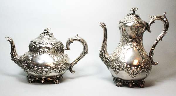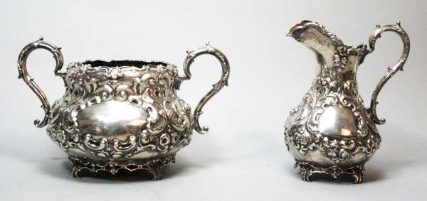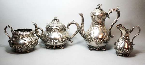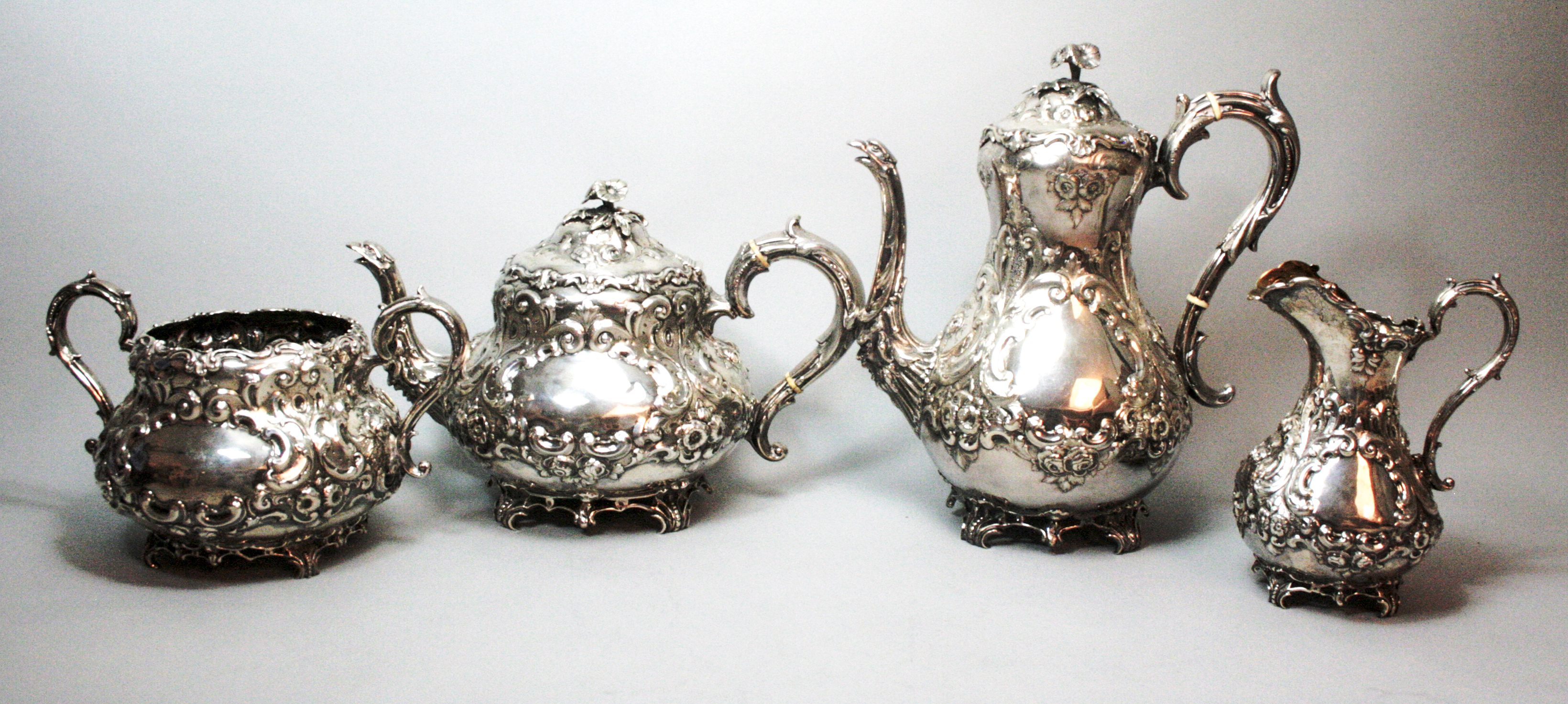 teapot, twin handled sugar bowl and milk jug, Martin Hall, Sheffield 1857, each of baluster from with embossed floral and foliate panels and cartouches, raise on four open bracket feet; together with a matching silver plated coffee pot (4)