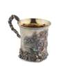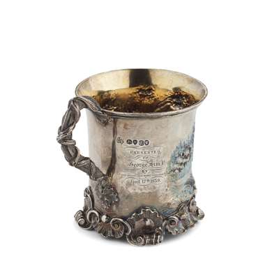 London 1838, of can form with finely chased scene of a woman gathering water from within a traditional landscape, with naturalistic handle and presentation inscription, raised on a cast shell and scroll foot
